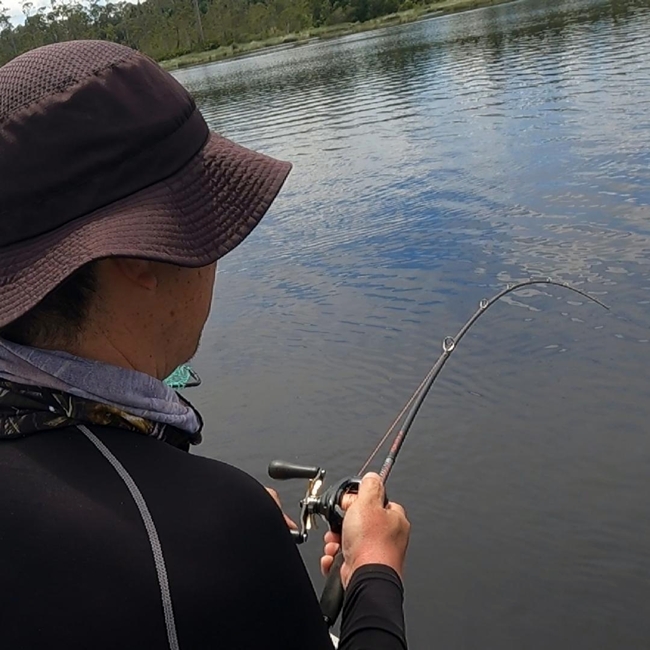 バズベイトのブラインド打ちでも何度かバイトがあり、そのうちの1度はフッキングしました。目の前で出たのと、ボートを早めに流していたのと、トーマンが手前に走ってきたのとで、悪い条件が重なってしまい、一瞬で船底に潜り込む形になり、ラインブレイク。