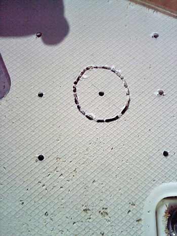![]() | ベースプレートの取り付け。中心部分が大きく出っぱっているので、穴を開ける必要があります。大きな穴を開けたい時、専用工具が無ければ、ドリルで細かい穴を沢山あけます。 |