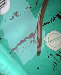 アタリがあったのでアワセますがノッた感触がなく「あれっ?」という感じで巻き始めた瞬間、急に重くなりました。一瞬、根掛りかと思いましたが、そんな疑問を吹き飛ばすような猛ダッシュ!ドラグが「ギャー」と鳴りっぱなしです。メインラインは1.5号だし、仕掛けはワゴンセールの3組100円みたいなやつだし無理は出来ません。ラインが半分位になった頃にやっと走りっぱなしの状態がおさまってきました。とは言っても竿をちょっと上げては巻き、巻いてはドラグが出るという一進一退の状態が続きます。たぶん釣れたシロギスにマゴチが食いついたんだろうなぁ、この引きだと超大物だろうなぁと釣れる前からニヤケちゃいます。腕も疲れ、カレコレ30分位(大げさじゃないよ)たった頃、水中に銀色っぽい魚が見えてきました。銀色?マゴチじゃないの?マゴチの腹の色?もしかしてスズキ?タモがないので、ボートにあったバケツ代わりのプラスチック桶(野沢菜とか入っていそうなやつ)ですくう事にしました。父親が、がんばってすくおうとしますが、桶が小さくてうまく入りません。3度くらい失敗しましたが、無事ボート内に取り込みました。釣れた魚をよく見てみるとボラです。しかもスレ。どうりで魚が弱らずに走る訳です。デカマゴチだと思っていただけに、もうがっかりしてしまいました。