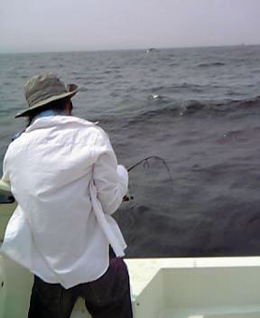 とりあえず伯父イトコはコマセなしサビキを落とします。これにはイワシが掛かったのみ。僕はジグを落としてみるとスグにヒット。バスロッドなので竿がグングン曲がるしドラグが出まくりです。あげてみると45cm位のサバ。たぶん僕が今まで釣ったサバの中で一番大きかったです。