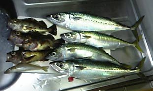 今日はめずらしくコマセを持って来たのでアンカーを打って釣りをする事にします。かけ上がりの19m付近でサビキ×1ビシ×1で始めます。すると近くのボートが寄ってきました。「もうちょっと浅い所がいいよ。2号以上じゃないと仕掛けが切られる」とのアドバイス。さらに「付け餌は青イソがいいよ、もうクーラー満タンで帰るから青イソ持ってなければ残りをあげるよ」との事。ありがたく頂戴しアドバイス通り15m付近に移動し青イソを付けて再スタートです。まずはビシへ普通サイズのサバが来ました。次はサビキの方ですが引きが強い!先週もブッツンブッツン糸を切られたので慎重にやりとりをして無事大型サバをゲット。次もサビキの方ですがこのサバは黄色っぽくて油がノってそうな感じです。