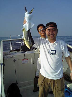 城ヶ島沖に行くと、ゴミの浮いている潮目を発見。ゴミは固まっておらずバラバラなので、適当にボートを流しながら釣る事にします。しばらくするとシイラが寄ってきました。するとバウで釣っていたミケンさんのミノーに魚がヒット。しかしこれはサバ。お次もミケンさんにヒット。これはシイラでした。
