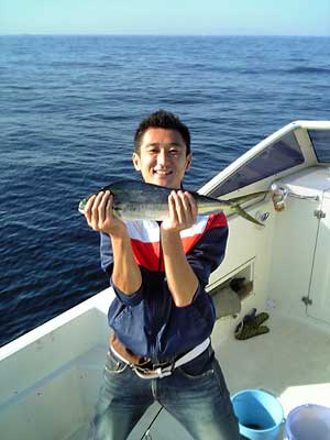 久里浜あたりから1人船酔いです。とりあえず寝っころがせておいて、どんどん南下します。しばらく走ると城ヶ島沖で潮目を発見。沖側は透明度の高い深い青です。これで釣れたも同然。定番のTDソルトペンシルドラドチューンをキャストします。1投目からシイラが寄って来て、2投目でドカンと出ました。寄せてくるとペンペンの大群が追って来ます。それからはイレ食いモードに突入、いつのまにか船酔いの彼もヘッチャラな顔をして釣りを楽しんでいます。