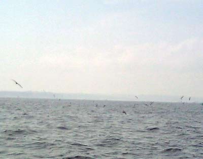 1時間位昼寝して、第2ラウンドは神奈川側を南下します。何も見つけられないまま久里浜沖まで来てしまいました。双眼鏡で遠くを見ていると下浦沖方面に鳥山発見、急行します。近づいてみると鳥の数がスゴイです。興奮してメタルジグを投げると1発でヒット。ロッドに伝わってくるブルブル感がサバサバしてましたが、上げてみるとやはりサバ。サバはいらないよ、と思いながらも投げるとすぐにサバが食いつきます。下には違う魚がいるかもと思い、ジグを沈めてみてもサバ。サバしか釣れないのでイヤになり少し走ってみますが、あたり一面、鳥トリとり。たぶん海の中は、鯖サバさば。何も釣れないと「サバでも釣れないかなぁ」なんて思うし、いざサバが釣れると「ケッ、サバかよ」なんて言われたり可哀相なもんです。
