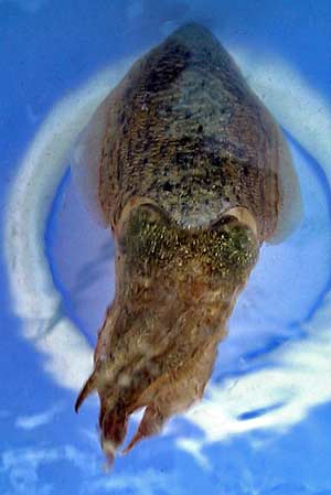 場所を移動し、沖ノ根の北の水深20m付近でやってみます。仕掛けも胴付はやめて中オモリにします。しばらくしたらグンと何か掛かった感じ。巻いてみるとイカの引きです。そ〜っと巻き上げてタモ入れ成功。スミイカでした。