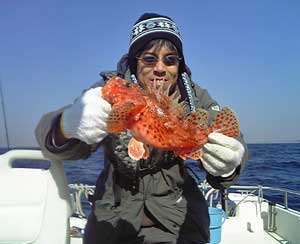 仕掛けを新しくして4投目、バスで言うところのリフトアンドフォールで誘うとゴンと、明確なアタリが出ました。巻き上げるとヒメコダイ&トラギスよりあきらかに重たく魚の引きを感じます。もしや本命?慎重に巻いて海面に姿を現したのはオニカサゴ。タモに入った時は嬉しかったぁ。釣れたのは水深110m位でした。
