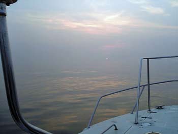 朝もやの中、期待を胸にボートを走らせます