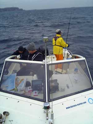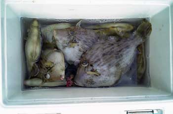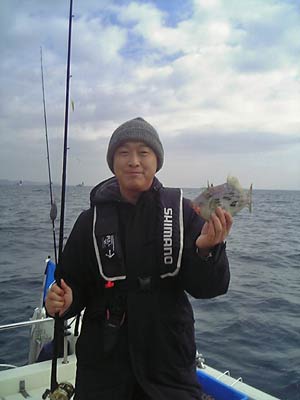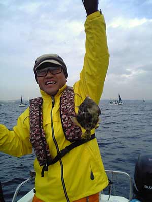 さてさて北東の風が少々吹いているので、剣崎をまわりこんで向こう側へ行ってみます。そのまま、なんとなく江奈湾の沖で始める事にします。時間は9時頃だったかな。まわりにはカワハギ狙いっぽい船がチラホラ。魚探で本で読んだ通りに砂地と岩場の境目を探し、浅めの16m付近から流します。すぐにO谷さんとH口さんがポンポンと3匹ゲット。お〜幸先いいね〜実はキーパー4匹揃わなかったら恥ずかしいな〜と少々不安だったのですがいきなり3匹釣れたので、こりゃ大丈夫そうだとひと安心。その後は流すラインをだんだんと深めにし、35m位の場所までやりましたが、アタリは続きポチポチ釣れる感じでした。