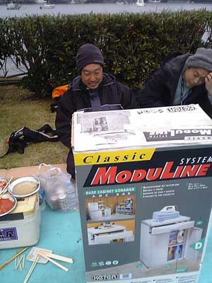 この大会は表彰式前の料理も、揚げ物だらけじゃなくて凝ったモノも多く、ナカナカ美味しくて良いです。表彰式のあとはじゃんけん大会。うちらのチームではH口さんが何だか巨大な物入れをゲット。じゃんけんは単純なだけに熱くなって盛り上がりますね。でも今回残念だったのが、あるチームが遅出し&勝手に敗者復活している事にうちのメンバーが気付いてしまいました。子供までそれを積極的にやっていて(やらせていて?)頭に来るというより、むしろ悲しい気持ちになりました。ボートに乗って釣りをするくらいだから、お金がなくて困っている訳でもないでしょう。遊びなんだからねぇ。そんなやり方を見ていると、そのチームの魚も疑いたくなってしまうってもんです。実に残念でした。それはそうと、我がチームはH口さん以外の3人は、絶望的にじゃんけんが弱かった〜。3人いたら確立1/3のハズなのに、3人仲良く1回で敗退が多すぎました。