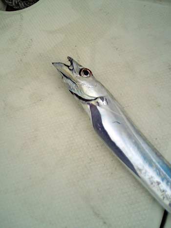 という訳で、深い場所へ仕掛けを落としてみる事にしました。潮はあまり流れていない感じなので、ほぼ一直線に落ちていくとして限度かと思われる250m付近で投入。魚探は高出力タイプではないので、さすがに底をとるのがやっとです。底に着いたら置竿で、昼ごはんを食べていると竿がピクピク言っています。ちょっと待ってから回収。延々と手巻きで280mのラインを巻くと銀色の魚があがってきました。なんだなんだと思いボートにあげるとタチウオです。それともタチモドキなどの親戚でしょうか。さすがに目が飛び出しているし、内臓が膨れていました。(ちなみに後日調べたところ、タチモドキは尻尾が違うようです。たしか普通のタチウオの尻尾だったような気がしますが不明)