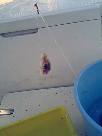 風が少々強めで、何度かスプレーを浴びながら中ノ瀬へ到着。水深25m位の場所でやってみると1投目からブルブルとアタリ。その後も休む事なく釣れ、元々少なめだった青イソはすぐに無くなってしまいました。最後の青イソちゃんを投入し、アタリがあったところで巻き始めると、いきなり竿をひったくるような重みが!ドラグが滑りましたが、すぐに軽くなってしまいました。上げてみると頭だけのシロギス…。あ〜あとちょっとで釣り納めにふさわしい立派な魚が釣れたのに〜