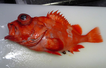 次に選んだポイントは浮島沖の水深400m。5本針は面倒なので3本針へチェンジ。底についてしばらくすると竿がピクピク、しばらく待ってからスイッチオン。巻き上げ中に竿先を見ていたらいつの間にか居眠り。電動リールの止まる音で目が覚めます。残り1mを手巻きで上げると、赤い魚がくっ付いている!「小さいけどアコウが釣れた〜」と喜んでみたものの、僕はアコウを見たことがありません。よくよく考えてみたらこれがアコウか判りません。まぁオタマジャクシと比べたら、はるかに美味しそうなので良しとして帰る事にしました。