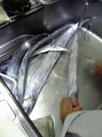 魚を並べて写真を撮ろうと思っていたのに、気づいたら、もうすでに父がさばき初めていました・・・
