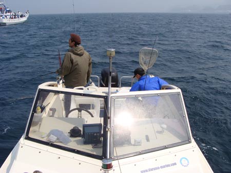 明鐘岬の沖で船が固まっているので、様子を見ているとマルイカを狙っているみたい。ボートの中からスッテ仕掛けを探しだして、ちょっとやってみる事にしました。