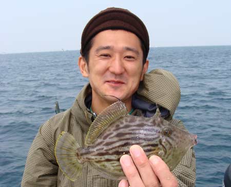 岩場なので伯父とイトコ夫はアオイソメでカサゴでも釣れないかと探っているとイトコ夫がカワハギをゲット。