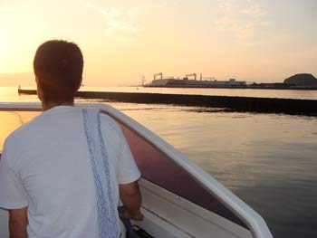 朝日を浴びながら、日の出とともに八景を出港