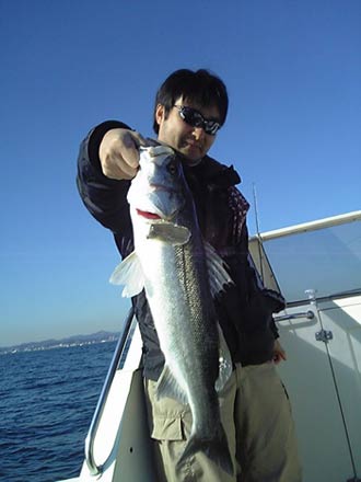 魚探反応はイイ感じ。シーバスかサバだろうと思っていると、タイラバで良型のシーバスがヒット。シーバスならとジギングへ切り替えたところ簡単に連続ヒット。