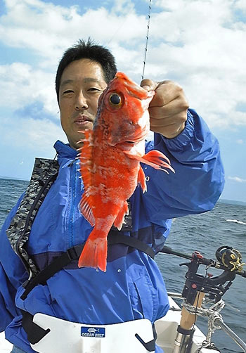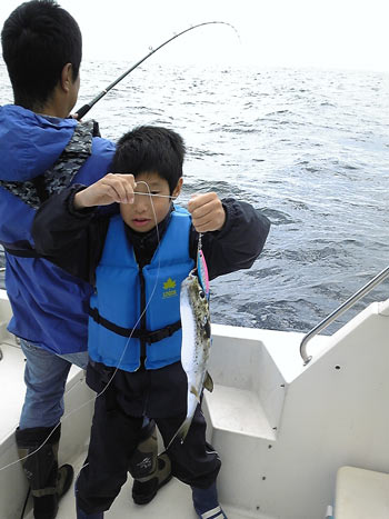 H口息子は酔っていましたが、ジギングをさせたところ、サバフグを釣り上げていました。