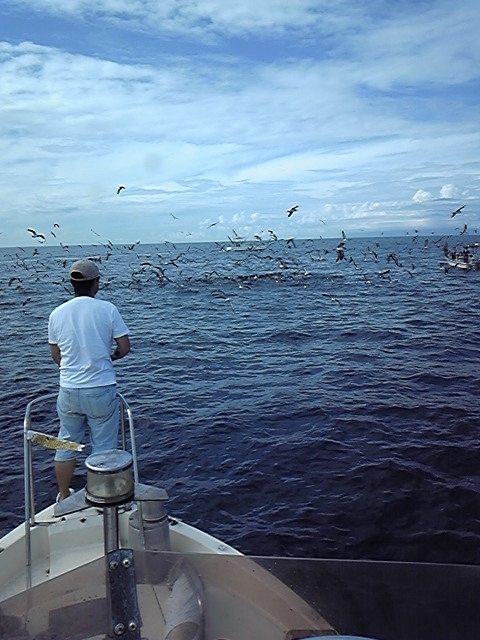沖の山に行ってみますが、スルメイカ狙いの船がいるだけなので、パヤオに向けてボートを走らせていると左前方に鳥山発見!