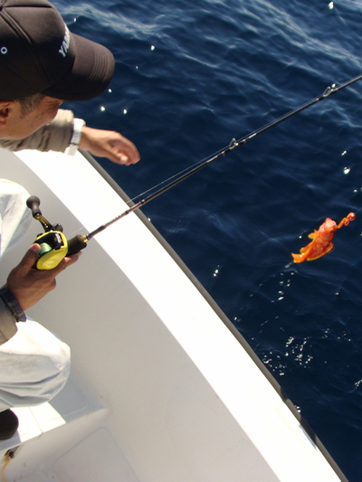 右のアウトリガーをちょうど見ていた時に、竿先がピクンピクンとし、あげてみると本命のショゴでした。