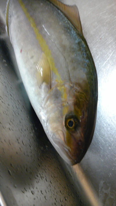 しばらく外道も釣れずにリールを巻きながらも居眠りをしそうになっていたら、突然強いアタリ。ギュンギュン引くので青物確定。イナダかと思っていたらショゴでした。