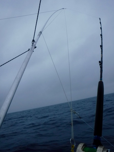 アウトリガーのゴムがパチンと切れた途端、リールがギャャー!と音を立て、すごい勢いで糸が出て行きましたが、30ポンドのメインラインが切れました。