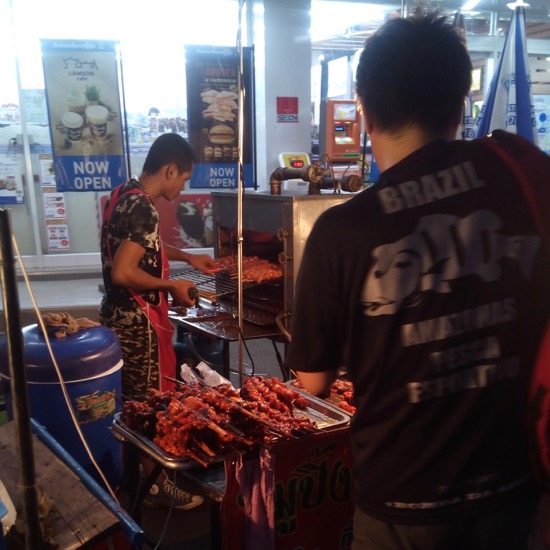 バンコクは屋台が多くあると聞いていましたが、屋台村みたいな感じで場所場所に集まっているのだと思っていたら、いたるところに屋台がありました。生活の一部なのですね。同級生Nが焼き鳥っぽいのを購入。