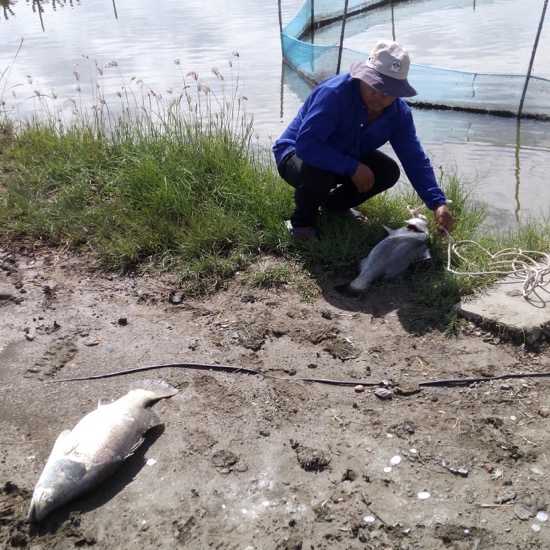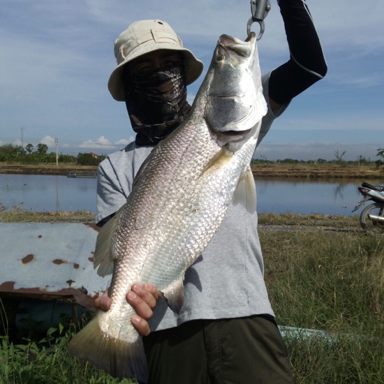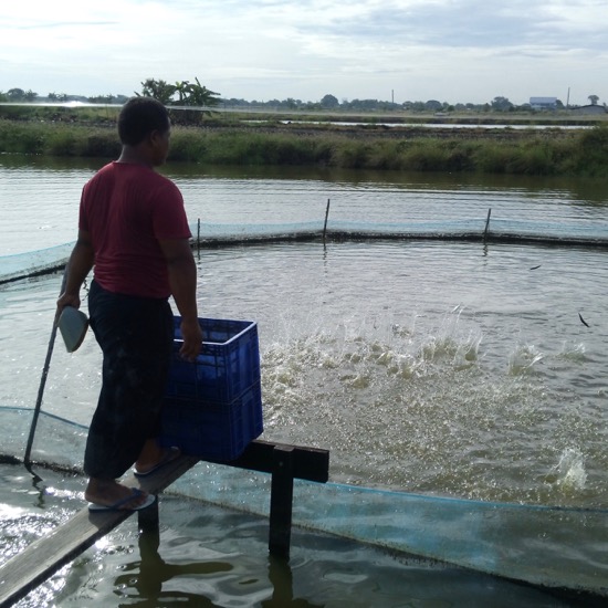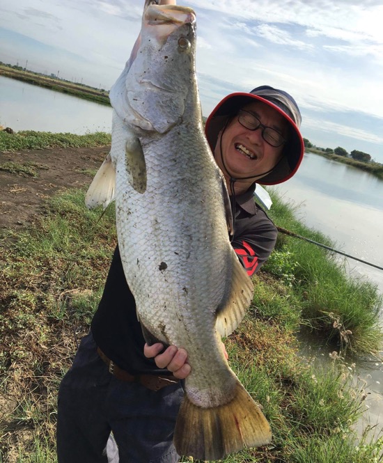 ブンマーは養殖池で食用のバラマンディを育てています。