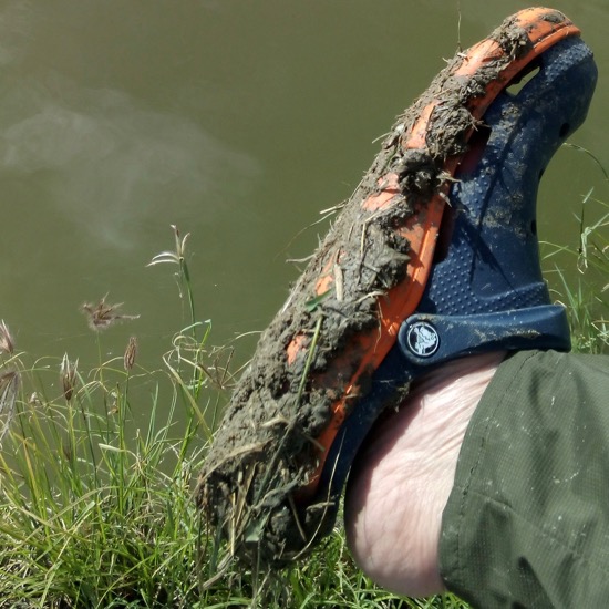 釣り場の土が粘土系です。クロックスで歩いていると足が団子になっていきます。