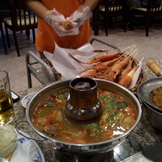 釣ったエビは塩焼きとトムヤムクンにしてもらいました。