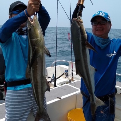 それを見ていたTさんとHさんが「ジグ釣れるじゃん」と、慌ててタックルをセットしジギングを始めると2人ともヒットし無事キャッチ。僕は火付け役だったのにキャッチできず残念。