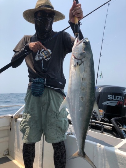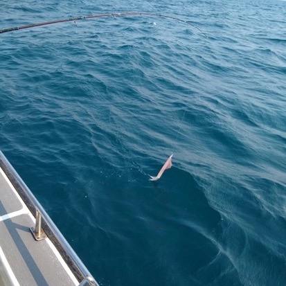 ジグより緑のバケフックがキモと思い、持ってきたヨーズリブランカに売ってもらったバケフックを付けジギングをしていると魚がヒット。コビアと思われましたが、中層でバラシ。