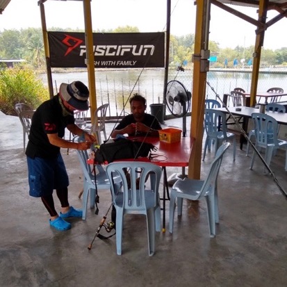 料金体系は、竿1本1時間あたりのようなので、1本の竿を3人で使い回すつもりでしたが、あれこれ言われて、結局3人で竿2本(レンタル)1時間でRm300(約7,800円)+エサ代Rm10(約260円、帰りに清算)