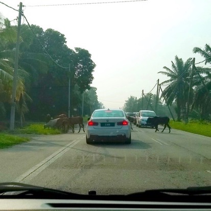 次の目的地へ向けて移動中に、牛が道路を横断しているところに出くわす・・・