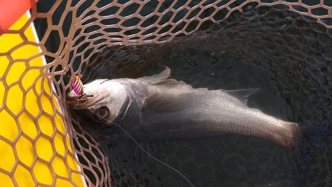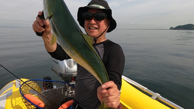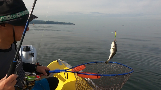 釣りの方は、ナブラが立っていましたが、そのわりに反応が悪い。ベイトが小さいようでした。それでも小さいジグを使って僕はフッコをキャッチ。T氏はフグと、ダニエルでワラサをキャッチ。幸せの黄色いボート入魂!。バラシなどもあったので全体的にもっと丁寧に釣りをすれば釣果が増えたのかもしれませんが、それができないんだよなぁ。
