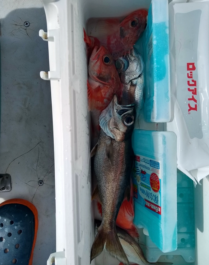 H口さんは餌釣りでユメカサゴ×1、クロムツ×1、シロムツ×2、ギンメ×1、サメ×1。