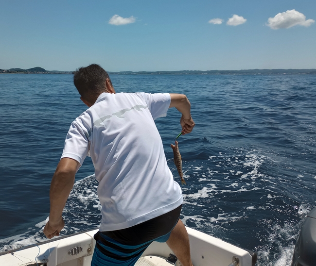 ボートで海水浴のついでに往路で曳いてみました。