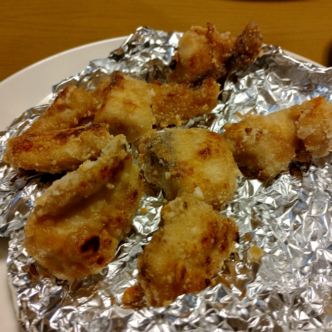 サバはキープして、皮を深場餌用に加工、身は味付けて粉付けて、焼いてみました(竜田揚げ風)