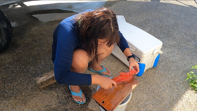 S女史はアカハタを下処理してからお持ち帰り。