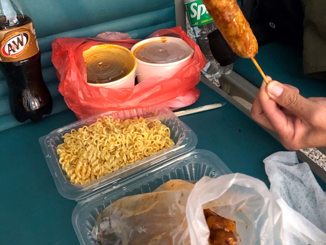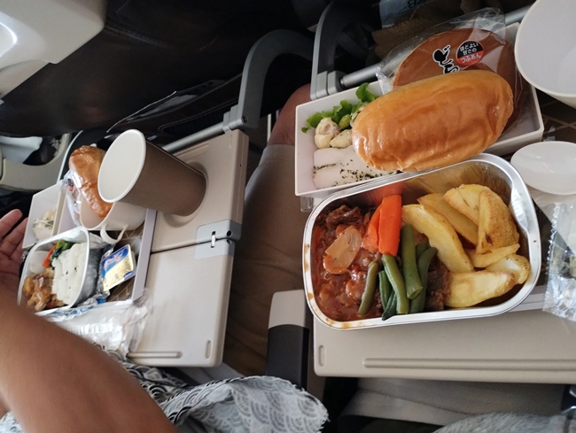 Beef or Chikenでしたが、ハラル的にはどうなんだろうと思っていたら、隣の年配女性は、メインを食べずに持参したカップラーメンを食べていました。普通に食べている人の方が多い感じだったので、人それぞれの厳格さによって違うのだと思います。