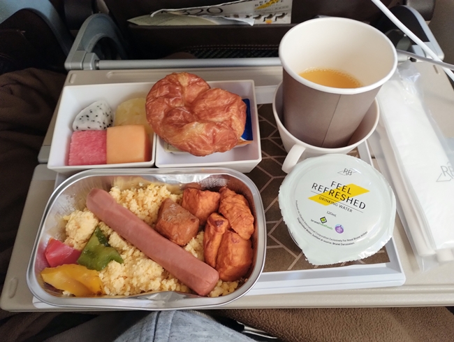 成田に着く前に機内食のサービスがありました。ビーフカレーかチキンソーセージ。写真だと唐揚げみたいに見えるものが、厚揚げっぽいけどデンプン感もあって、これまで食べたことのないものでした。