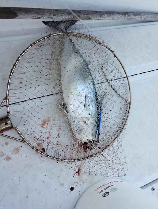 そのポイントで、まずは僕のジグにヒット。ブルブル感がサバっぽいけど、どうも重たいなと思ったら、大きなソウダ。