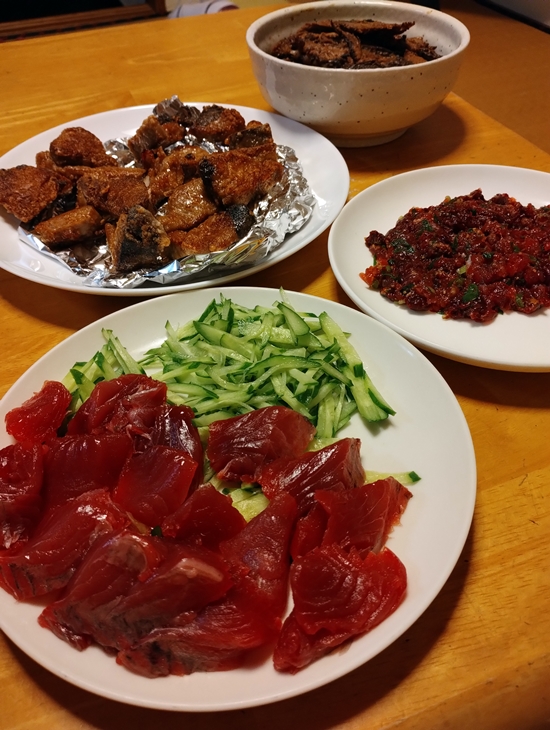 ヒラソウダは、刺身、血合いのナメロウ、竜田揚げ、アラ煮にしてみましたが美味。