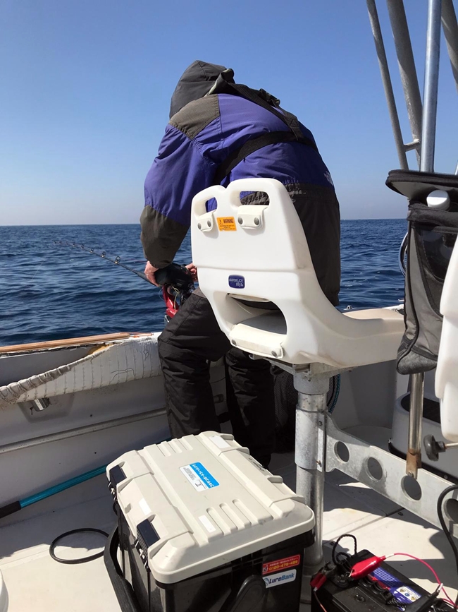電動リールのエサ釣りで、餌は前日の会社帰りにスーパーで買ったサバ(ゴマサバ1匹398円)