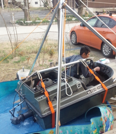 単管パイプで簡単な櫓を組んでボートを持ち上げ、子供プールの中へ着水。
