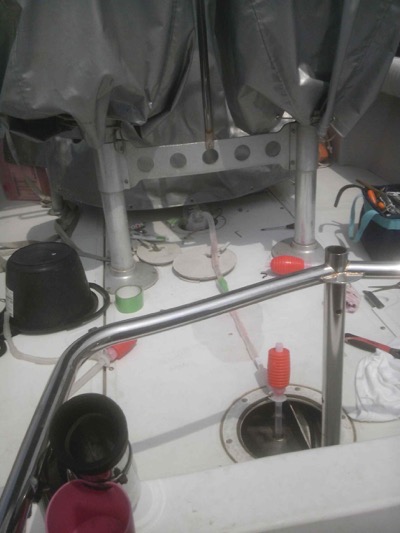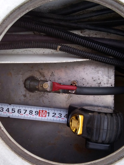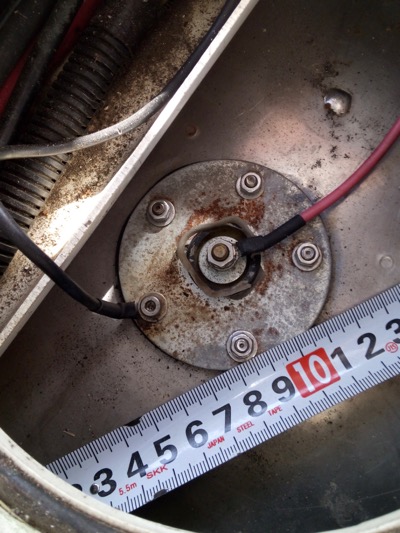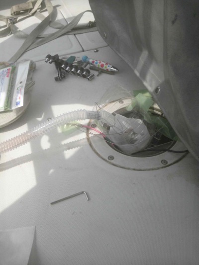 フィルターでゴミが沢山ということはタンク内が汚れていると思われたので、タンク内を掃除したいところですが、このボートの燃料タンクは床下に埋め込まれており、取り外すのはかなり大掛かりな工事になります。仕方ないので、燃料計センサーの穴(直径5cm位)と、燃料吸い出しパイプの穴(直径2cm位)を使って掃除することにしました。