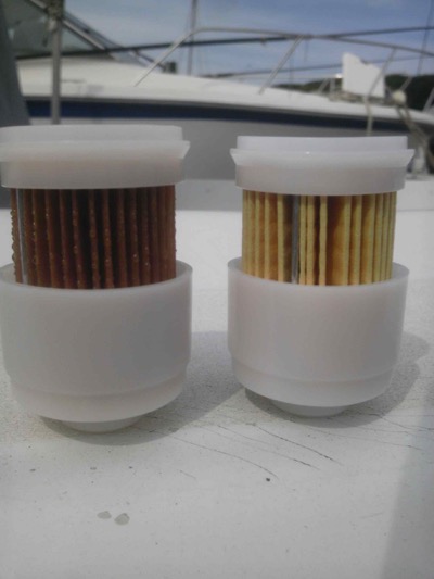 頭を悩ませながら、ふと船外機の燃料フィルターを外してみると、水滴らしきものが付いています。