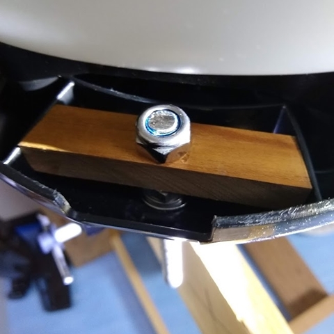 プラスチックカバーをボルトナットで絞めこむだけだと心もとないので、内部仕切りへ力が分散するように木片を挟みました。