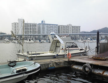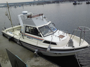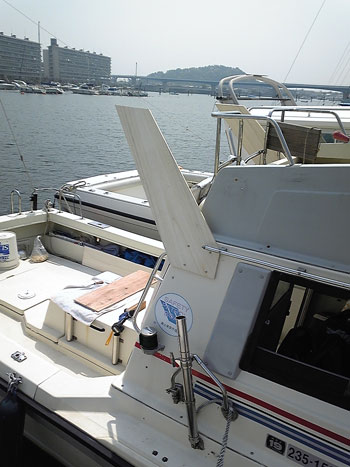 ![]() | まずはどこに付けるか検討。ボート雑誌などで色々見てみるとFBの付け根?に付いているのが多い。しかし僕のボートの場合FB部分はボルトをしめるのに手が入らないので、仕方なくFBより下の部分に取り付ける事に決定。 |