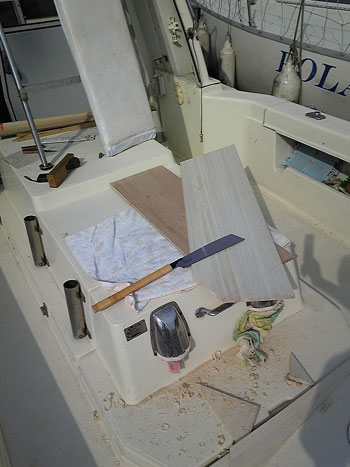 ![]() | 曲線は面倒なのでカクカクしたデザインです。ボルトナットで船体と仮止めして、この後上に板を載せビスで固定し形をキメました。 |